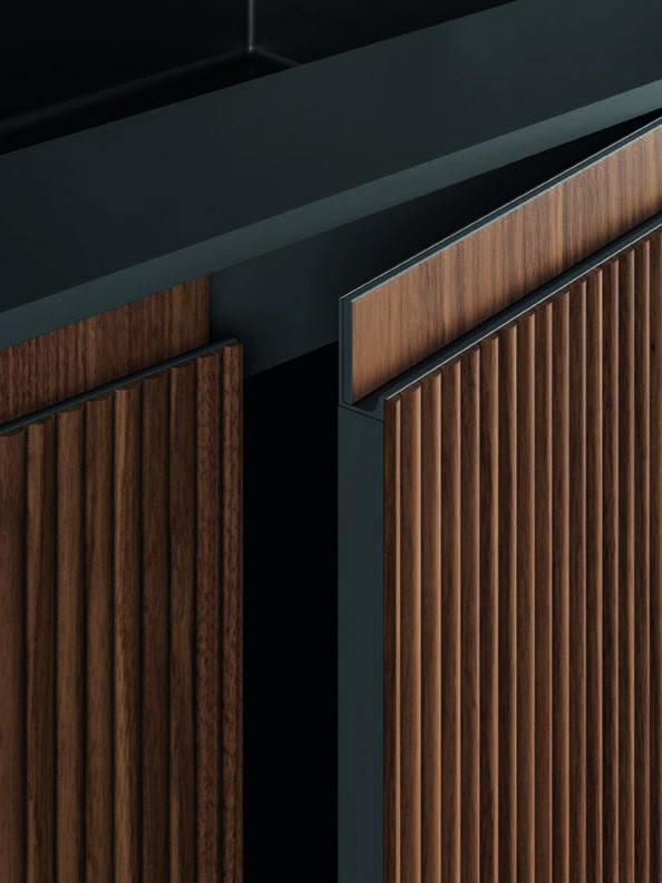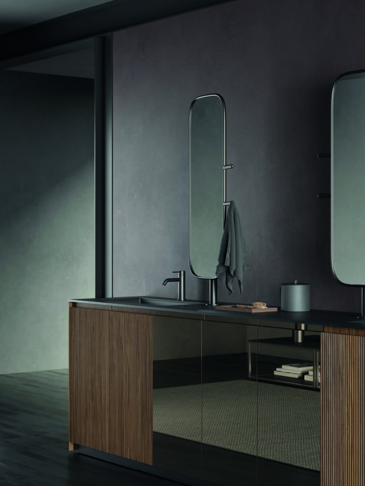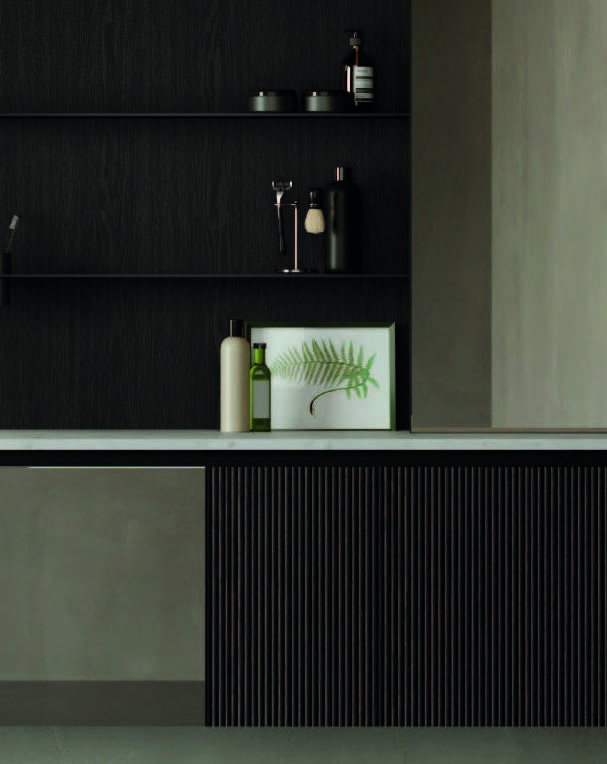 - Ahşap Detaylar: Koleksiyonda yer alan siyah ve derin kahverengi tonlarındaki kanallı meşe detaylar, mekanlara derinlik ve zarafet katmaktadır. Ayrıca, Amerikan cevizinden yapılmış lavabo üniteleri, mekanlarda sıcak ve davetkar bir atmosfer yaratır. Ahşap yüzeylerin doğal dokusu, modern yaşam alanlarına doğal bir şıklık katarak kullanıcılara benzersiz bir deneyim sunar.