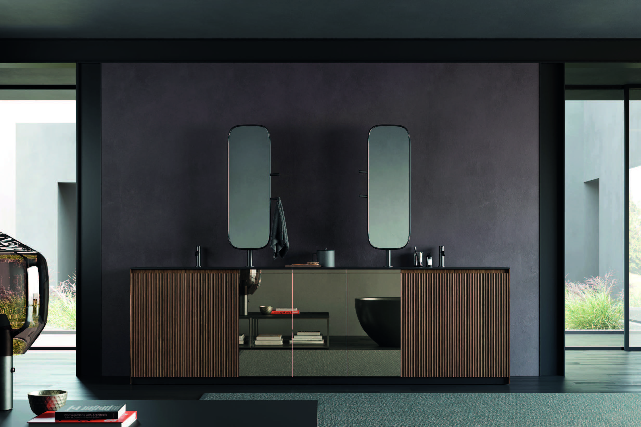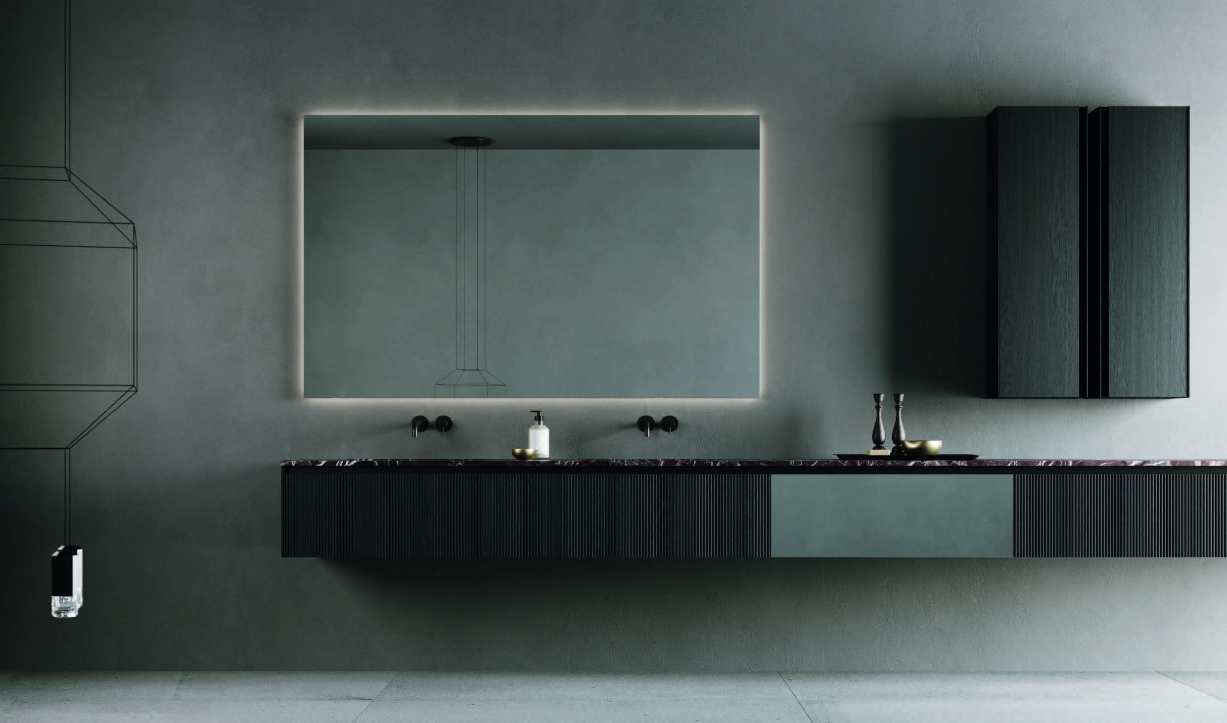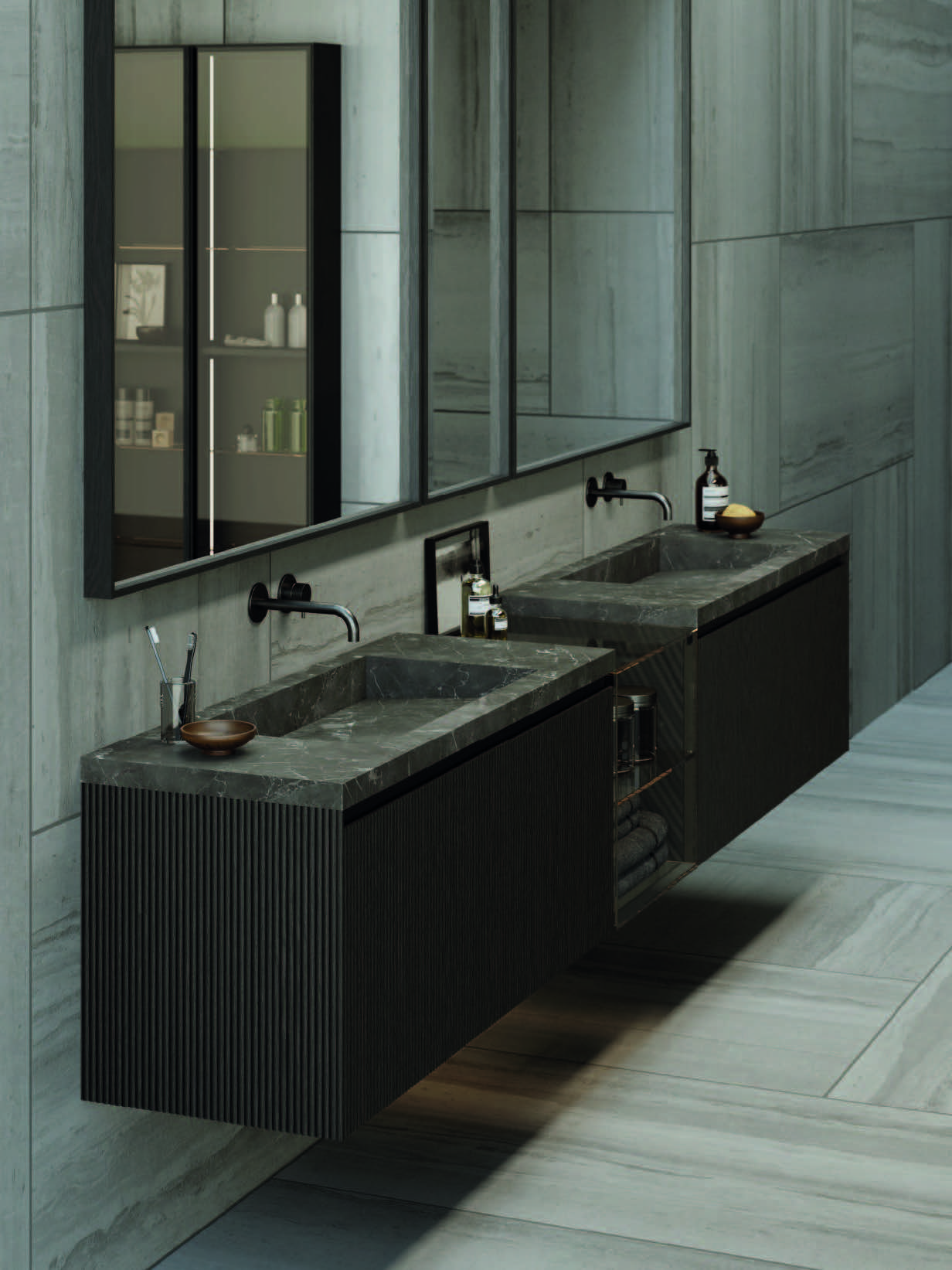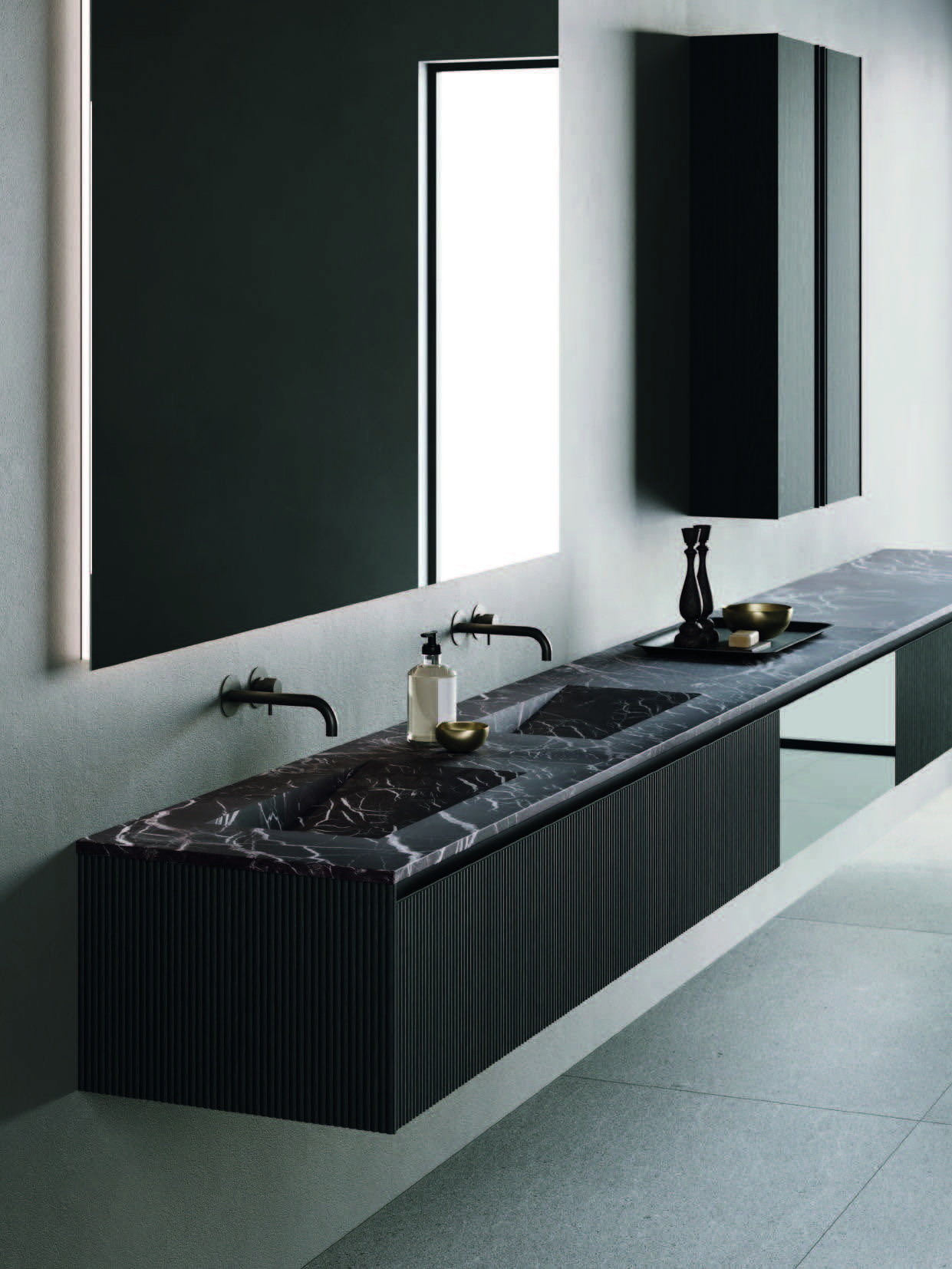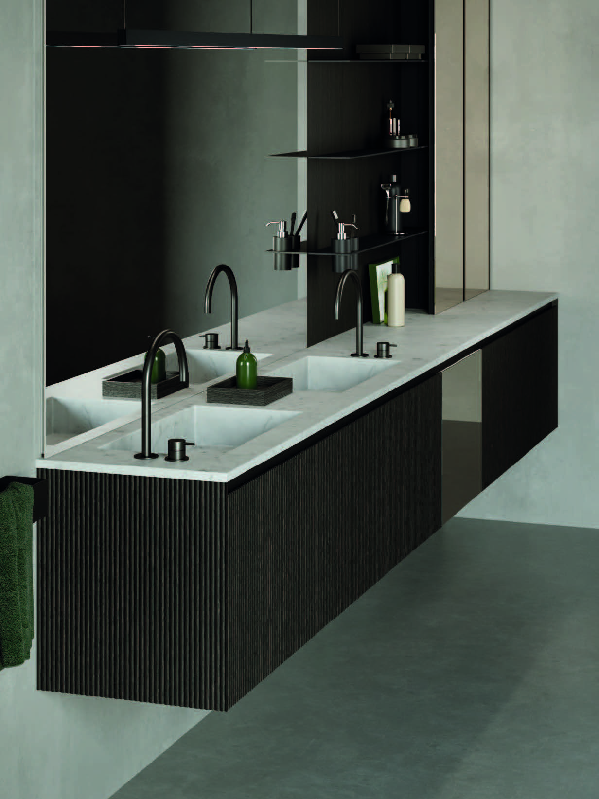 - Lavabo Üniteleri: Siyah meşe, derin kahverengi meşe ve Amerikan cevizinden yapılmış lavabo üniteleri, Fenix® Nero Ingo veya Colle Mandina mermerinden yapılmış entegre lavabo üstleri ile birleştirilmiştir. Bu üniteler, hem işlevsellik hem de estetik açıdan üst düzey performans sunar.