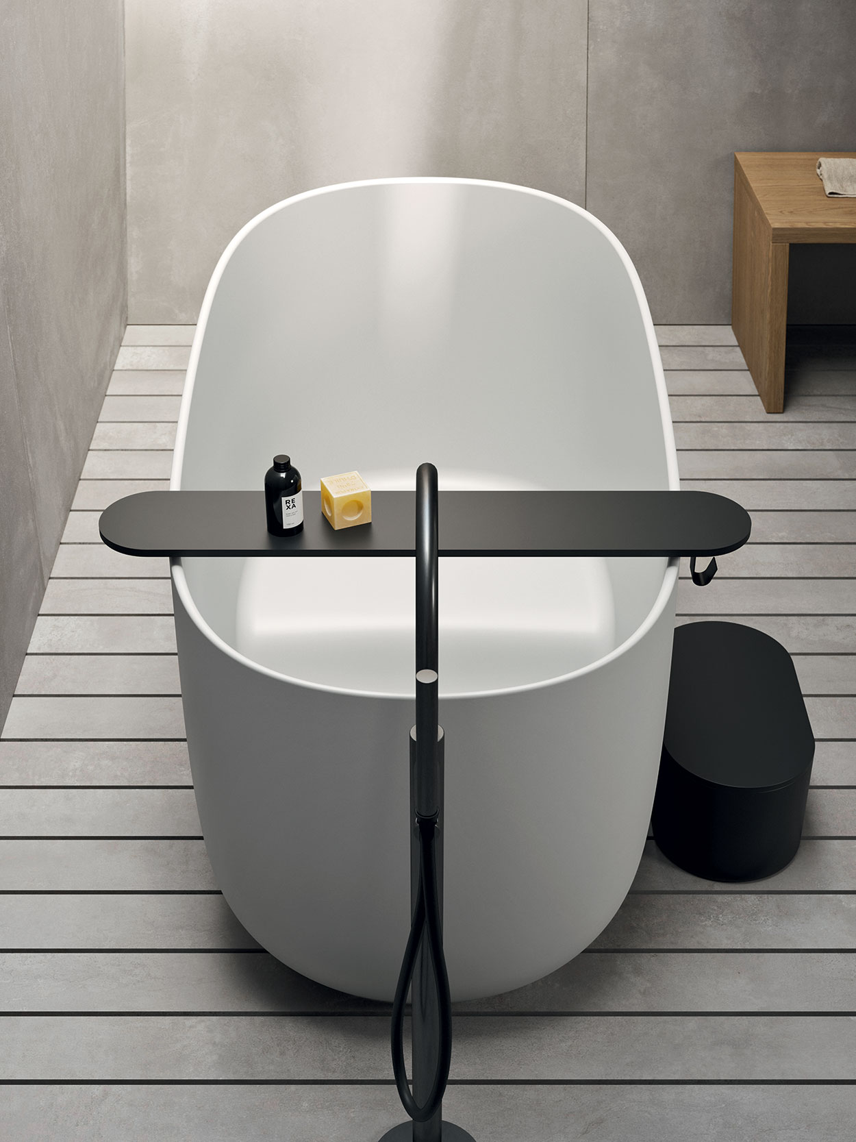 “Dip” serisi, bağımsız (freestanding) bir küvet olarak tasarlanmıştır. Bu özellik, küvetin herhangi bir duvara monte edilmeden, özgürce yerleştirilebilmesine olanak tanır. Japonya’nın geleneksel Ofuro banyolarından ilham alan bu tasarım, kullanıcının tamamen suya dalarak rahatlamasını teşvik eden derin ve kompakt bir forma sahiptir (REXA Design) (Archiproducts).